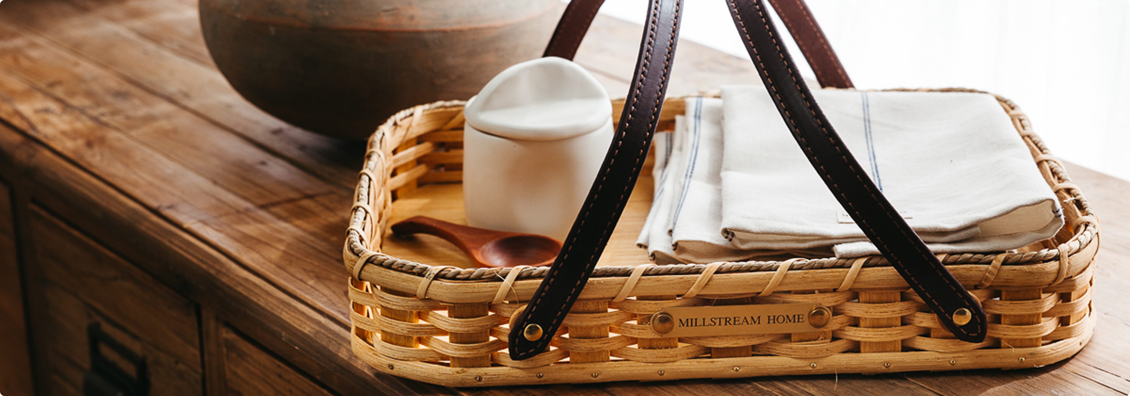 Handwoven in Lancaster, Pennsylvania, our signature American-made baskets are crafted by Amish families who have refined their art over generations. Each basket is soaked, woven, assembled, and dyed entirely by hand using only simple tools. Finished with hand-hammered brass tacks, full-grain bridle leather handles, and a custom-etched Millstream Home brass plate, every detail reflects enduring craftsmanship. Made in humble sheds and barns, each basket is built to serve, and to last, for a lifetime.